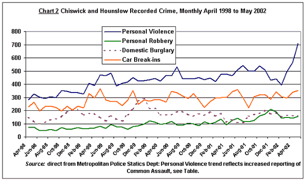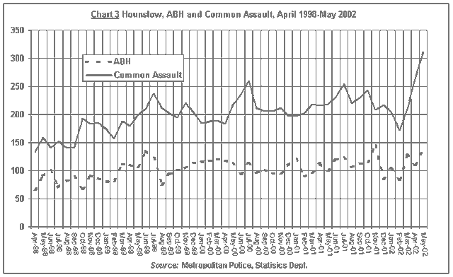 The Police have discretion as to whether to decide that a reported crime should be recorded. Eg a publican calls the police because there is a brawl. They arrive and find a number of young men with black eyes, bloody noses and slashed cheeks. But all refuse to press charges. What should be recorded? In the past the answer has varied from crime to crime, police force to police force and from time to time. Government has now imposed standardisation, with two effects - a greater proportion of reported crimes will be recorded and the changeover is being made by different police forces at different times. This makes recent recorded crime figures difficult to interpret. It is my impression that at least in respect of some crimes, the Hounslow and Chiswick police district made the changeover between February and April this year (2002). This would explain the otherwise unexplained near-doubling of cases of Common Assault recorded by police in the Borough between those two months. (See Chart 3 below).