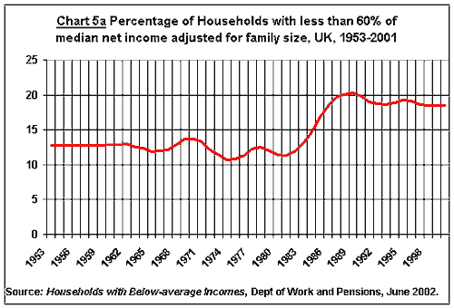 in practice, faster than the population. In the half century that has just passed neither of these things happened. Consequently the crime rate per head of population rose steadily. Then in the middle nineteen-eighties, condition (2) went sharply in the wrong direction. Between 1985 the proportion of households below 60% of the median net income rose from 10% to 20%. (See Chart 5a)