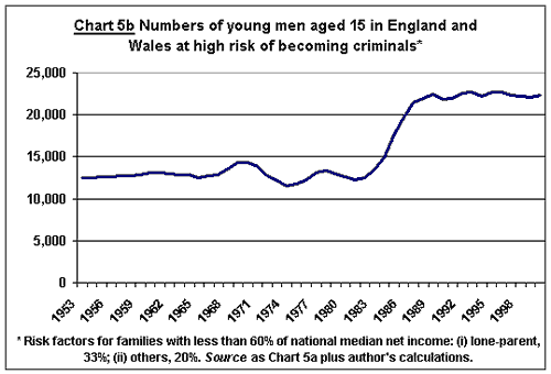 The proportion of boys aged 15 raised in a lone-mother family which was also poor went from 20% in 1980 to 45% in 1990 and fortunately fell back to 35% in 2000. We don't have historical statistics on stepfathers but I have estimated (See Chart 5b) that there must in fact have been a corresponding jump in the supply of potential criminals.