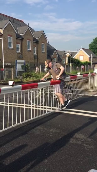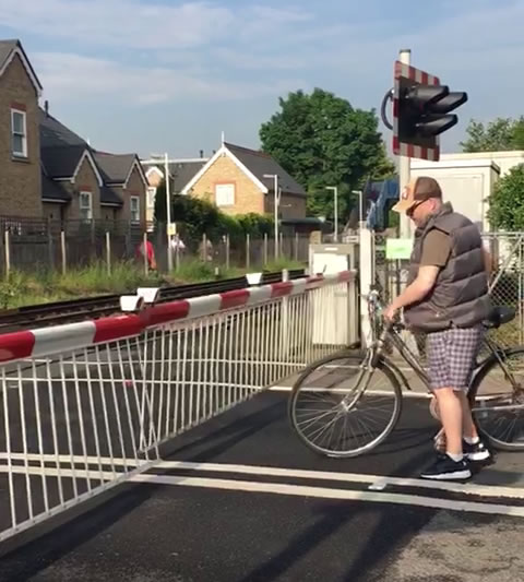 He lifted his bike over before forcing his way between the barriers at North Sheen level crossing on Manor Road during the morning of Thursday 11 May 2017. His actions were witnessed by commuters, schoolchildren and parents who pleaded with him to wait.