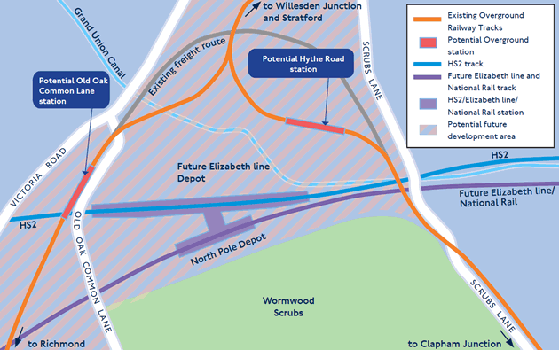 A major interchange station on Old Oak Common Lane would link London Overground’s North London Line, Elizabeth line (Crossrail) and HS2 rail services linking stations such as Gunnersbury, South Acton and Acton Central. This potential new station would be situated about 350 metres to the west of HS2 and Elizabeth line station between Old Oak Common and Midland Terrace.