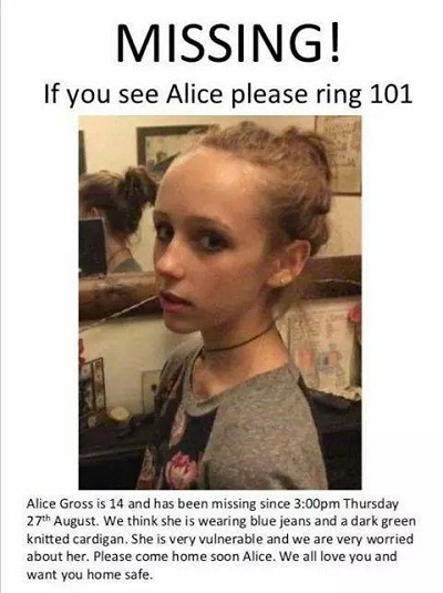 Police have been searching for Alice using the police helicopter, specialist officers and dog handlers.
