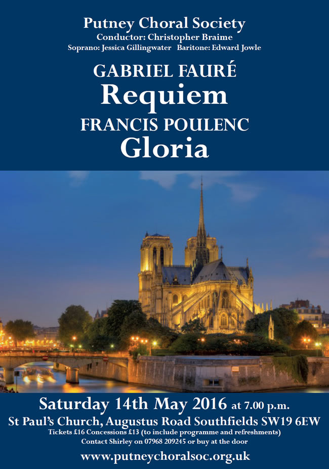May 14th 2016 - a performance of Fauré's Requiem and Poulenc's Gloria, at 7pm in St. Paul's church, Augustus Road, Southfields SW19 6EW.
