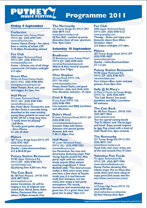 Come to Putney for the amazing Putney Music Festival, featuring live and DJ presented music throughout Putney’s eclectic range of pubs, clubs and restaurants on the 9th and 10th September.