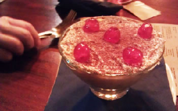 I have to say it's about the biggest £3.50 dessert I've ever had on a night out (see left). It was actually similar to a trifle and was simply scrumptious, with a definite taste of real brandy. Had we asked for one each though, we'd never been able to finish it off!