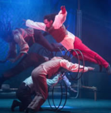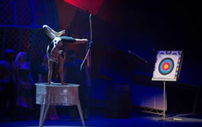 Cirque Berserk is an eclectic mixture of traditional acts with modern characteristics. For nearly two hours we were watching performers swing down from the ceiling or jump through hoops. There's a Odka the archer from Mongolia who uses her toes to aim the bow and fire the arrow- there's the breath-stopping drama of a man throwing knives while his partner stands rigid, and we loved the Timbukru tumblers who limbo under flaming bars and jump through hoops.