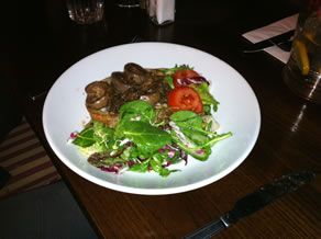 First courses range from soup (roast pumpkin with crouton and parmesan, £4.95) to bruschetta with grilled halloumi cheese, roast peppers and mixed leaf salad (£6.50). We opted for kidneys on toast with shallots and Worcestershire sauce at £6 and creamed chestnut mushrooms on toast with baby spinach, poached egg and mixed leaves at £6.50.