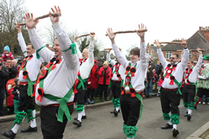 A crowd of several hundred spectators gathered on Boxing Day to watch Greensleeves Morris Men, Merton’s popular local Morris dancing side, perform their traditional Mummers play and dance outside the Hand in Hand and neighbouring Crooked Billet public houses on the Crooked Billet at the edge of Wimbledon Common.