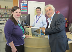 Leader of Merton Council, Councillor Stephen Alambritis with staff at Donald Hope Library