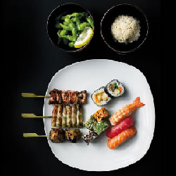 My companion opted for the 'Mixed Emotion' platter which, for £17.50, included nine different sushi salmon, tuna, prawn and vegetable rolls; three sticks with chicken, bacon/asparagus and pork; edameme beans; a choice of rice or potato salad (see left).