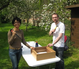 Karine Fischer and Arnaud Robert (pictured right while building hive parts) need to raise £1,000 by March 16 to have enough funding for their new project.