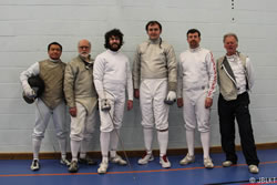 Wimbledon team: L-R Jean Li Kam Tin (foil), Simon White (sabre), Christopher Micklem (épée) Tom Bowey-Strange (s), Tim Buzwell (e) and Brian Harkins (f).