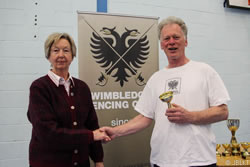 Jill Farmer of Wimbledon Fencing Club presents the individual foil trophy to Brian Harkins