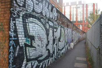 Long-standing graffiti on the wall of Wimbledon's Tuition House has been removed and the wall restored to its natural brickwork in work organised by Love Wimbledon in partnership with local business Wimbledon Offices Ltd.
