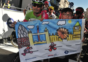 Keen cyclist Min Joon, aged 11, designed a colourful flag which showed cyclists whizzing past London landmarks including the Gherkin, the Houses of Parliament and the London Eye.