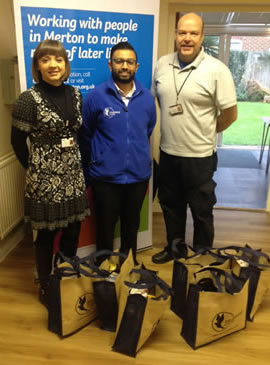 Charmaine Sainsbury, CEO of Age UK Merton and Andrew Browning, Age UK Merton Handyperson, are pictured taking delivery of 10 bags of winter warmth supplies donated by Jay Patel (centre), Director of Bluebird Care to help older people likely to be affected by the cold this winter.